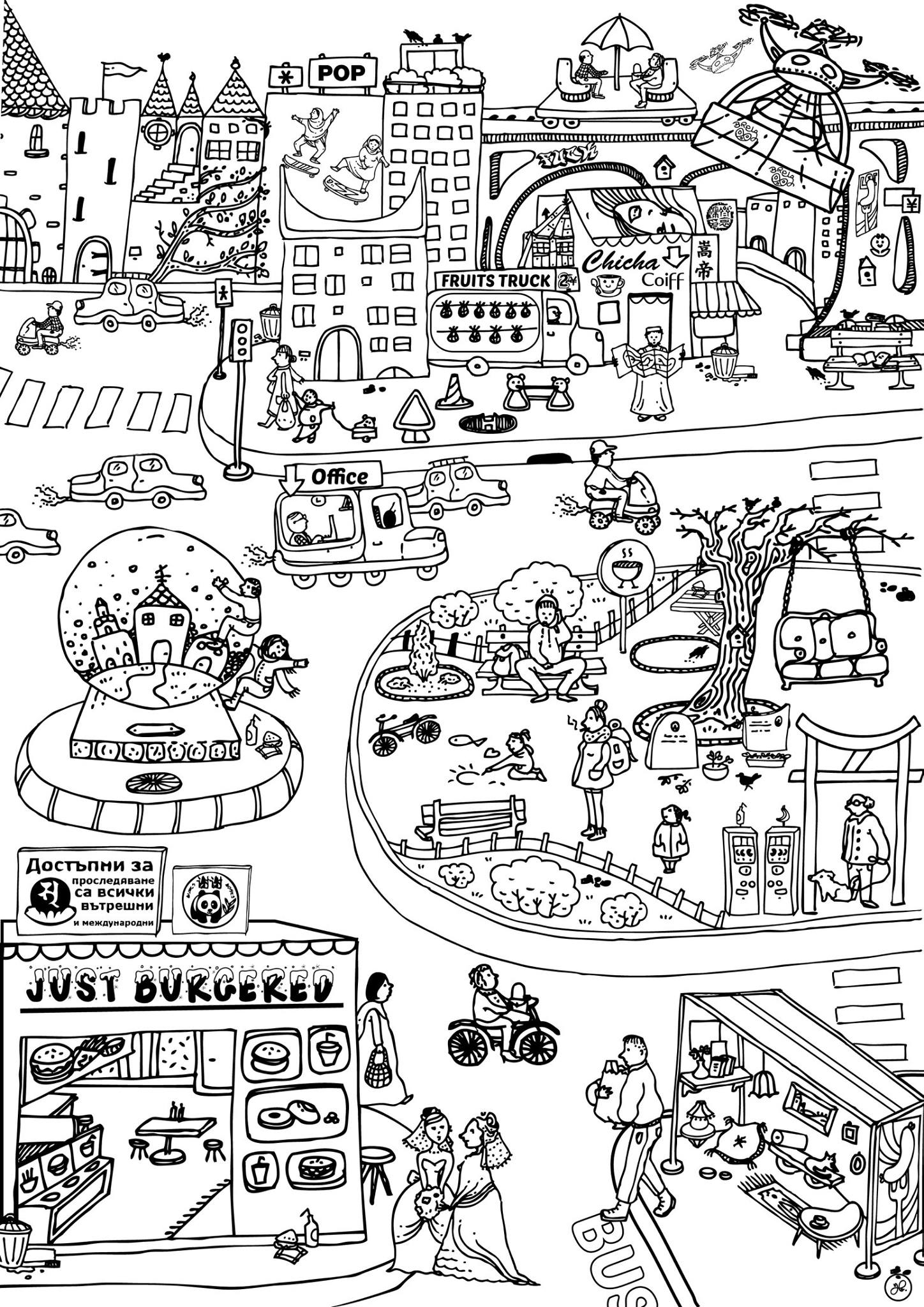 Le format un peu spécial de nos bons voeux 2016 permet en outre aux receveurs d’y ajouter leur grain de sel, aussi bigarré qu’il soit ! En effet, la carte postale traditionnelle s’est transformée en ville à colorier (téléchargeable ici ou en cliquant sur l’image ci-dessous)… On vous laisse y jeter un oeil, et avouez donc que vous mourrez d’envie de réveiller cette poignée de saynètes en la barbouillant de mille et un fards !